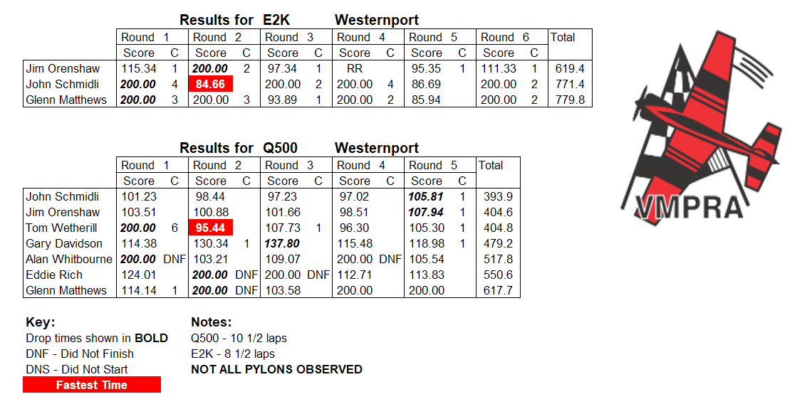 There was a full racing schedule for the weekend, with F3T, F3D, Q500, Sport class and E2K being flown on that order on Saturday. On Sunday, the order was changed to Q500, Sport class, E2K, F3D and then F3T. Four rounds of each class were flown each day. As per usual VMPRA practice, racing was conducted over 10 ½ laps to reduce the number of course workers required. The course was changed at midday on Sunday due to a change in wind direction.