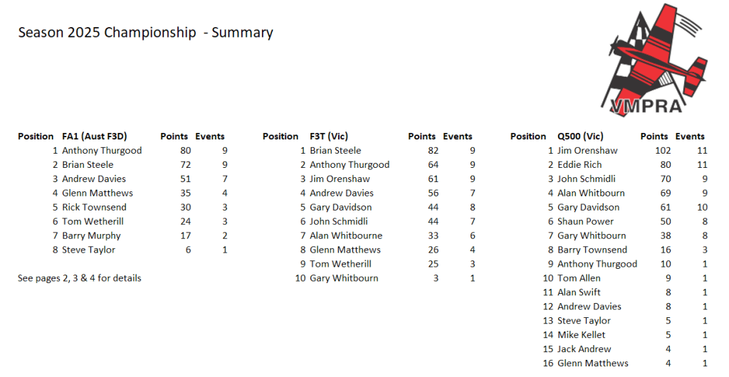 As of the VMPRA 2022 AGM, the season championship runs in line with a calendar year. Prior to this, the championship was from our usual AGM competition in July/August until the competition before the next AGM. Unless otherwise specified in the event calendar, all VMPRA events plus AMPRA, if held in Victoria, are included in the Championship.